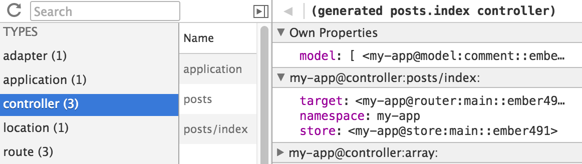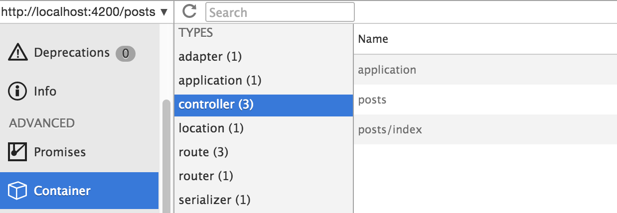 Every Ember application has a container that maintains object instances for you. You can inspect these instances using the Container tab. This is useful for objects that don't fall under a dedicated menu, such as services.