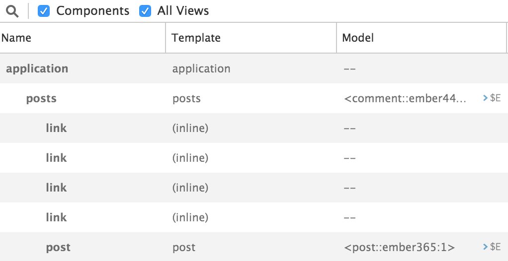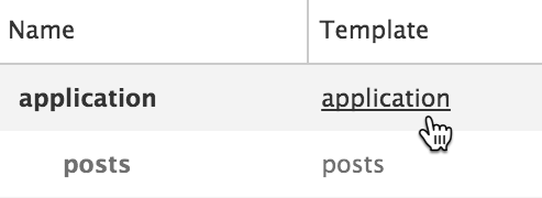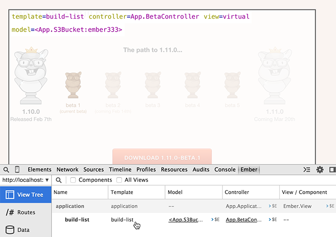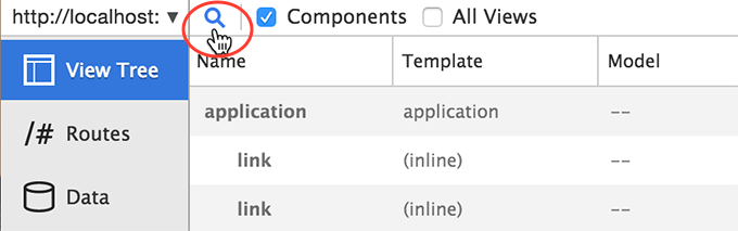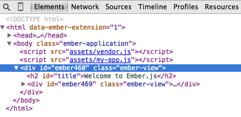 To see how a template was rendered by Ember, click on the template in the View Tree. If you're using Chrome or Firefox, you'll be sent to the Elements panel with that DOM element selected.