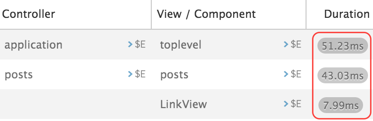 The Duration column displays the render time for a given template, including the template's children.