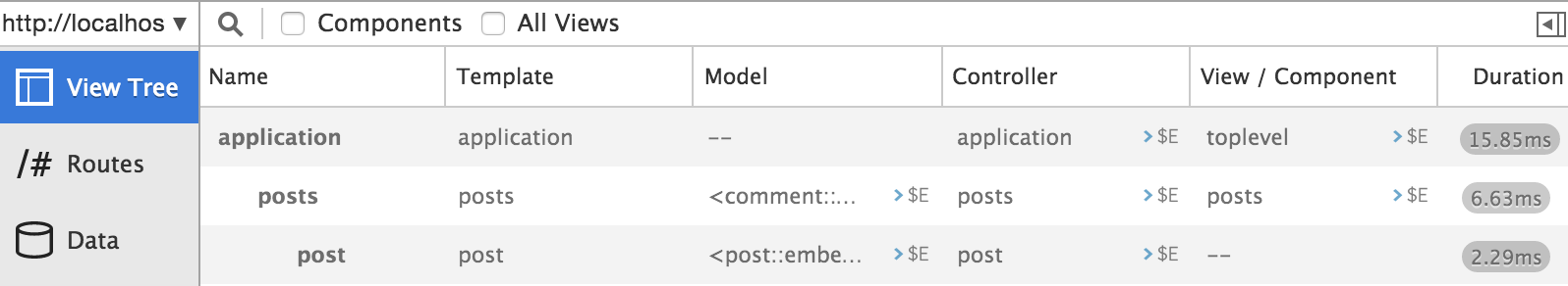 The View Tree shows you the currently rendered templates, models, controllers, and components, in a tree format. Click on the View Tree